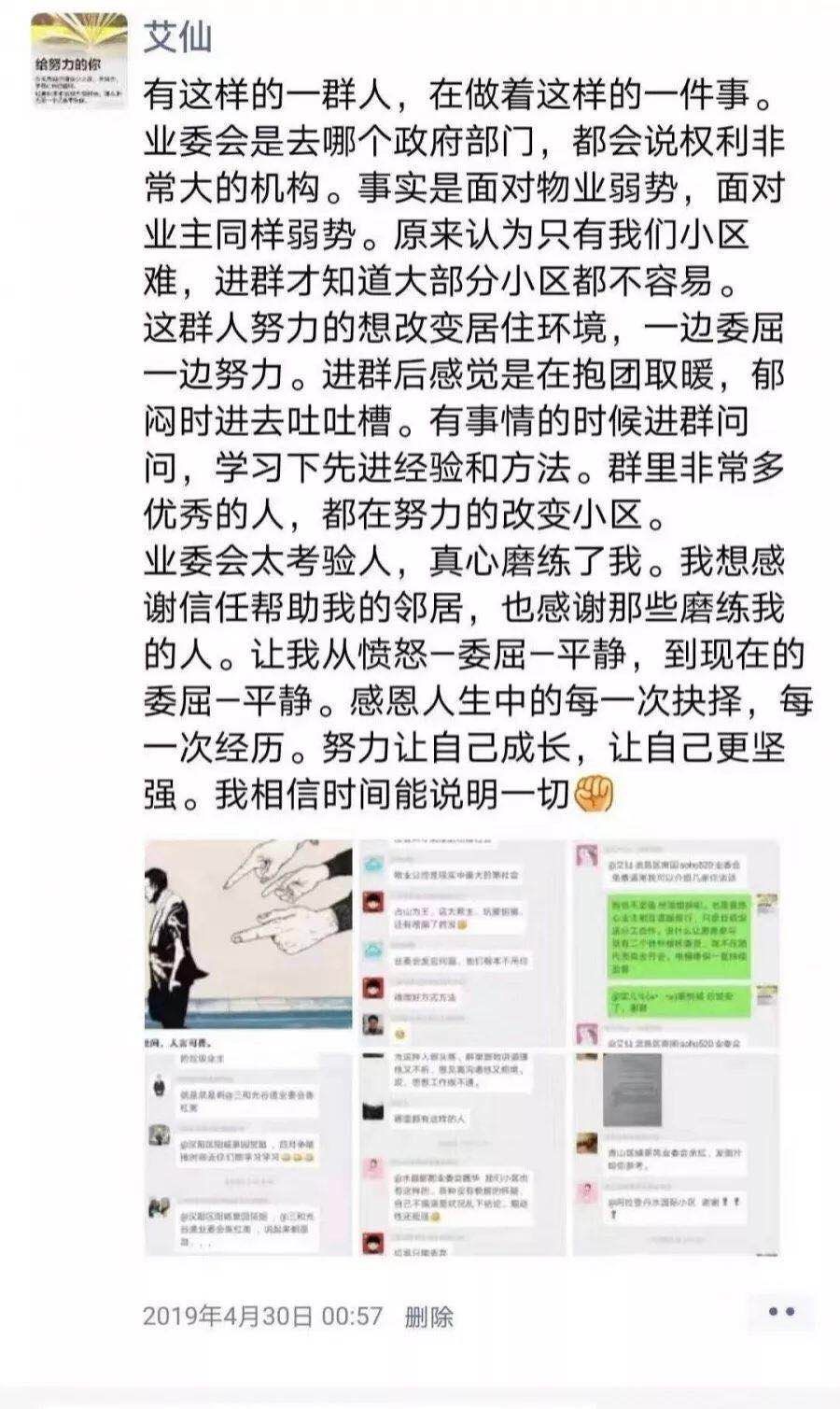 這個(gè)群現(xiàn)在成了“大家的家”,家里的每一位成員都自覺恪守群規(guī)群紀(jì),不發(fā)廣告,不做微商,不傳播負(fù)面信息,不發(fā)布過激言論,不違反政治輿論規(guī)則,在這里,在這個(gè)大家庭里,我們只交流物業(yè)管理知識(shí),只介紹業(yè)委會(huì)履職經(jīng)驗(yàn),大家取長(zhǎng)補(bǔ)短,互幫互助,共同為一個(gè)夢(mèng)想而努力,共同為打造每一個(gè)似曾相識(shí)而又差別迥異的小區(qū)事務(wù)出謀劃策。我們?cè)谝黄?共建這個(gè)家,只因?yàn)?我們有一個(gè)共同的目標(biāo),共同的信念——為創(chuàng)建自己美好的家園奉獻(xiàn)一已之力,為自己家園里的每一位業(yè)主維護(hù)一已之益,為我們共同的家園住的舒心,過得安心!